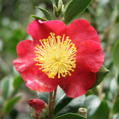 Le camélia d’automne Ruby enchante par sa floraison éclatante d'octobre à décembre, offrant de superbes fleurs simples d’un rouge rubis lumineux au cœur doré et au parfum délicat. Rustique et facile à vivre, il illumine les massifs, terrasses ou haies fleuries lorsque la plupart des plantes entrent en repos.