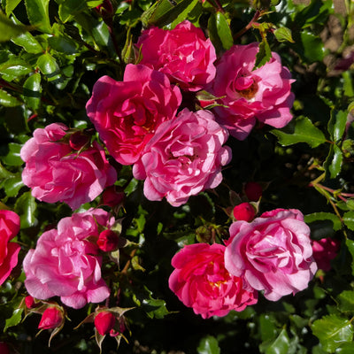 Le rosier Emera séduit par sa floraison incroyablement généreuse de petites fleurs simples à semi-doubles rose vif, qui se renouvellent sans arrêt du printemps jusqu’aux premières gelées.
