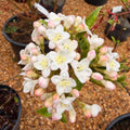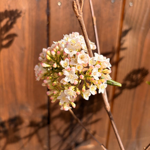 Le Viburnum × burkwoodii est un arbuste très apprécié pour sa floraison printanière intensément parfumée. Ses boutons roses s’ouvrent en bouquets de fleurs blanches délicates, créant un joli contraste et diffusant un parfum agréable au jardin. Son port souple et son feuillage décoratif en font un excellent choix pour les massifs, haies libres ou plantations près des zones de passage.